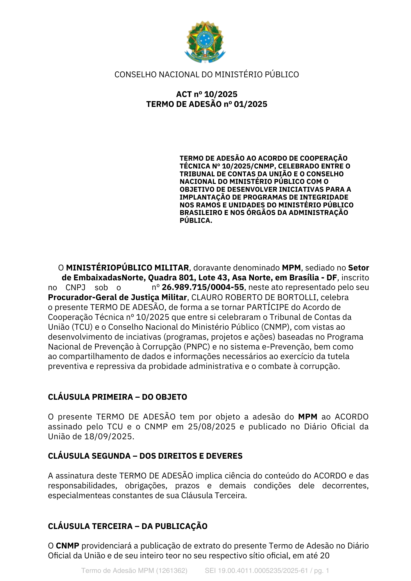 Adesão do MPM ao ACT nº 10/2025 celebrado entre CNMP e TCU