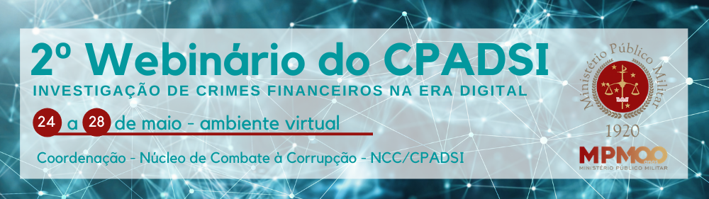 O Núcleo de Combate à Corrupção – NCC/CPADSI realizará seu 2° Webinário no período de 24 a 28 de maio de 2021, pelo canal do Ministério Público Militar no Youtube (youtube.com/c/ministeriopublicomilitar), com acesso restrito aos inscritos, e moderado pelo novo coordenador do NCC, o perito criminal federal Cupertino Medeiros.
