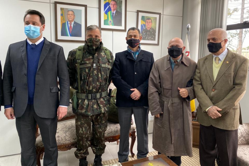 Na solenidade na 5ª Divisão de Exército, o governador Ratinho Júnior, o general de Divisão Fábio Benvenutti Castro, o procurador-geral Antônio Duarte, o procurador-geral Gilberto Giacoia e o ministro do STM Péricles Aurélio Queiroz.