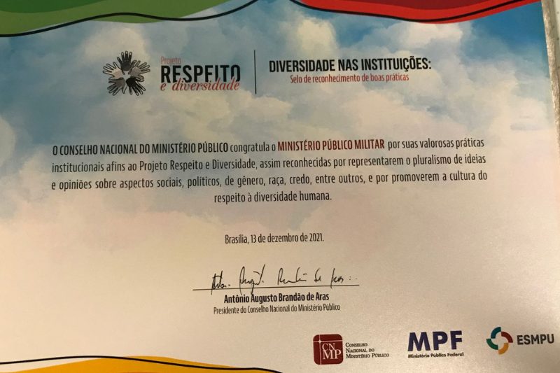 O Projeto Pró-Igualdade de Gênero e Raça (PPIGR) do Ministério Público Militar – Mostra a cara, MPM! – recebeu o selo de reconhecimento do Conselho Nacional do Ministério Público (CNMP) em cerimônia realizada nesta segunda-feira (13). A iniciativa do CNMP teve por objetivo comemorar o primeiro aniversário do projeto “Respeito e Diversidade” e condecorar com o selo as boas práticas das unidades do Ministério Público, associações e outras entidades aderentes ao projeto. No evento, transmitido ao vivo pelo canal do CNMP no YouTube, também foram celebradas parcerias interinstitucionais e anunciada a promoção de um curso sobre o tema liberdade de expressão.