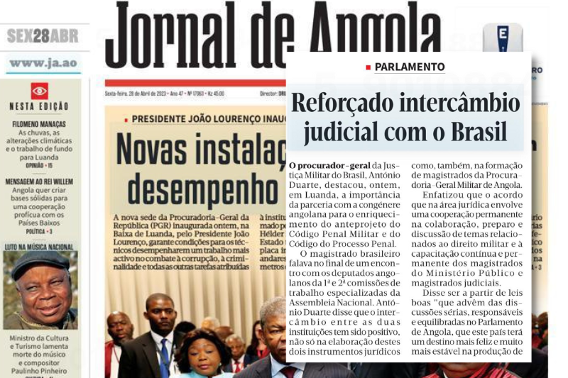 A parceria do Ministério Público Militar e de seu congênere angolano no debate da legislação penal e processual penal militar foi destaque em matéria publicada na edição de 28 de abril do Jornal de Angola. A publicação ressalta fala do PGJM, às autoridades locais, sobre a importância do intercâmbio não só na elaboração do anteprojeto de Código Penal Militar e do Código de Processo Penal Militar, como na formação de magistrados da Procuradoria-Geral Militar de Angola e do Supremo Tribunal Militar, sugerindo uma colaboração permanente para a discussão de temas específicos do direito militar e capacitação contínua dos magistrados e representantes do MP nos dois países. “Leis boas advêm das discussões sérias, responsáveis e equilibradas”, disse Antônio Duarte.