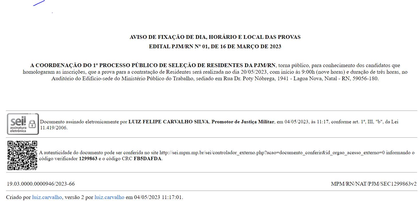 A Coordenação do 1º processo público da Procuradoria de Justiça Militar em Natal/RN torna público a homologação das inscrições do Programa de Residência Jurídica e a realização da prova no dia 20/05/2023, com início às 9h e duração de três horas, no Auditório do Edifício-sede do Ministério Público do Trabalho, sediado em Rua Dr. Poty Nóbrega, 1941 – Lagoa Nova, Natal – RN, 59056-180.