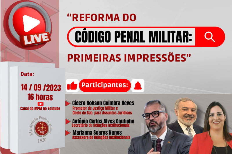 Hoje, 14 de setembro de 2023, às 16 horas, em seu canal do Youtube (youtube.com/c/ministeriopublicomilitar), o Ministério Público Militar promove a live “Reforma do Código Penal Militar: primeiras impressões”. Participarão dos debates: o promotor de Justiça Militar e chefe de Gabinete para Assuntos Jurídicos, Cícero Robson Coimbra Neves; o secretário de Relações Institucionais do MPM, Antônio Carlos Alves Coutinho; e, a assessora de Relações Institucionais do MPM, Marianna Soares Nunes.