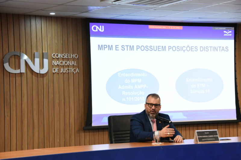 No primeiro dia do Seminário, o promotor de Justiça Militar Renato Brasileiro de Lima fez palestra sobre “Juízo de Garantias sob a perspectiva da Justiça Militar”. Já o promotor de Justiça Militar Cícero Robson Coimbra Neves, no dia 26 de outubro, abordou “A Justiça Militar e o Acordo de Não Persecução Penal” em sua apresentação.