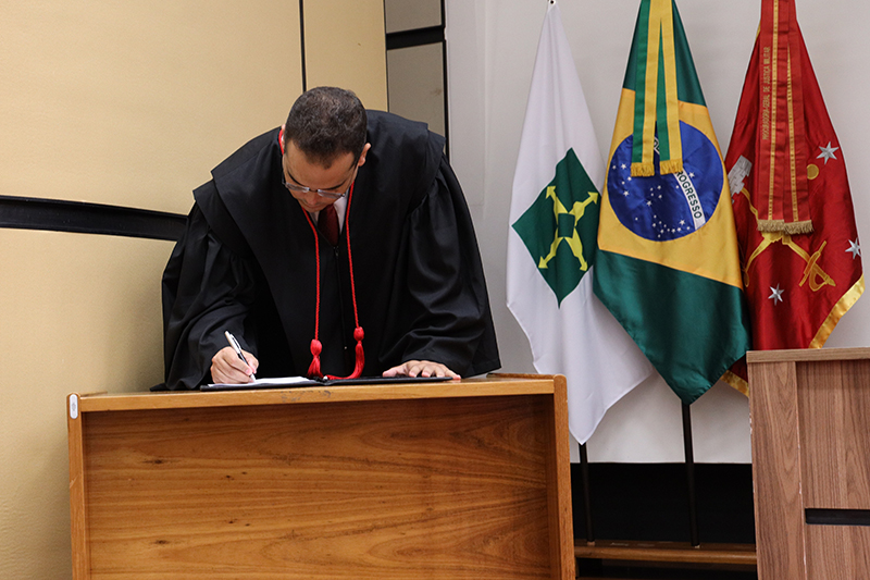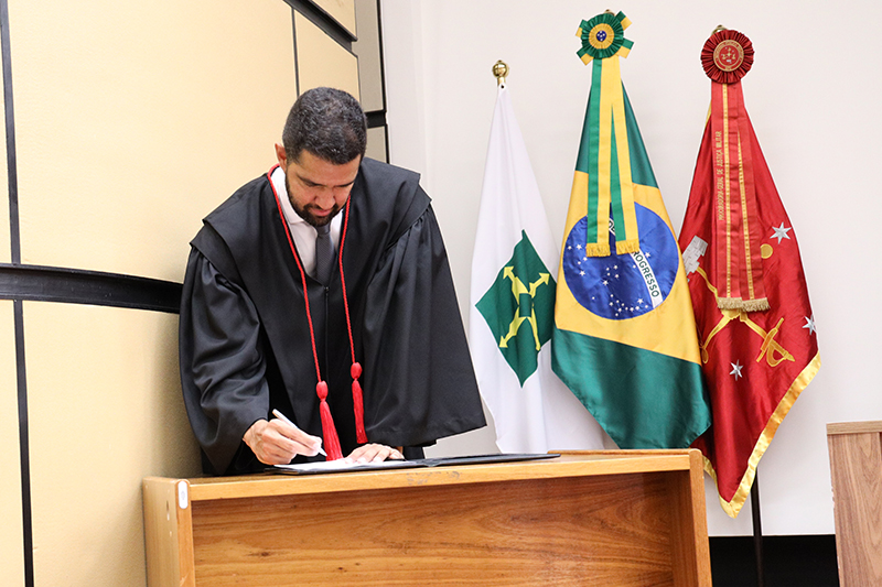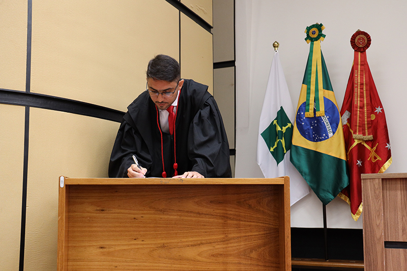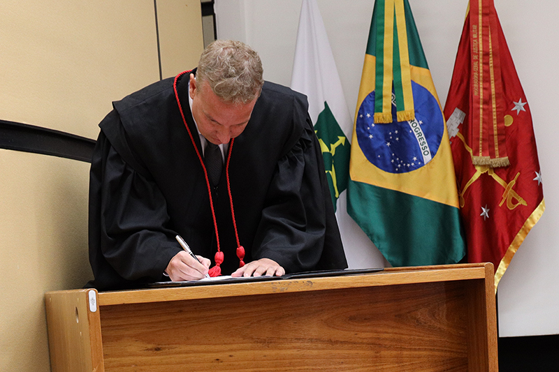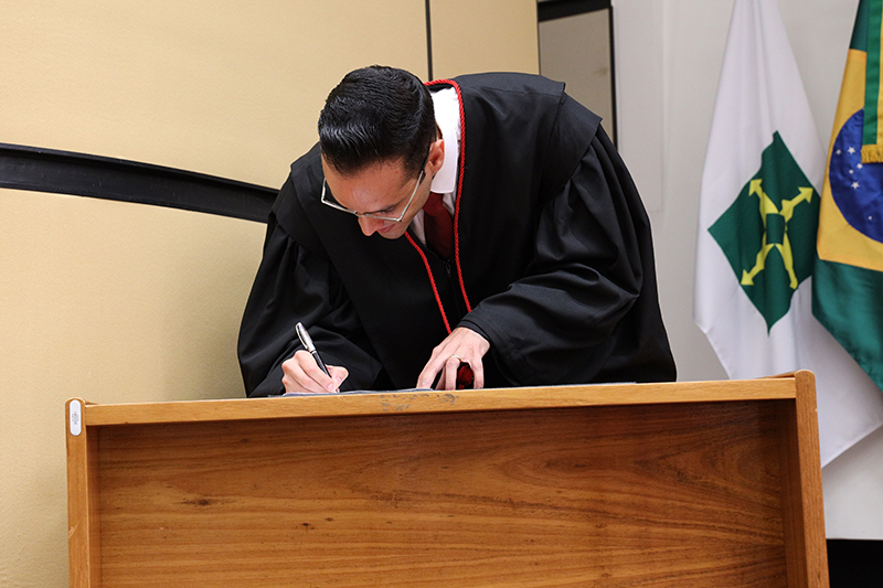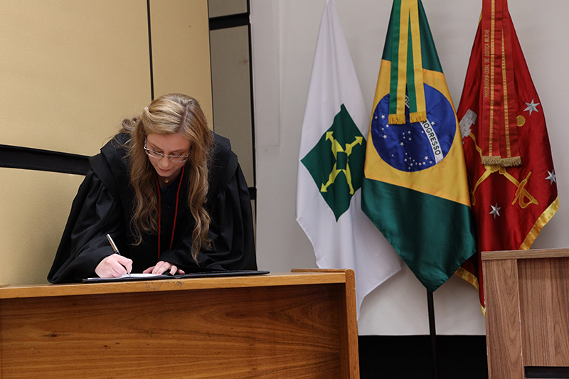 Compromisso – O termo de compromisso dos novos promotores foi lido pela promotora de Justiça Militar Fernanda Machado Lopes e acompanhado pelos colegas. Em seguida, o diretor-geral, Alexander Jorge Pires, fez a leitura do termo de posse dos aprovados no concurso, confirmando o ingresso como membros da instituição. Em seguida, o PGJM declarou oficialmente a investidura no cargo e convidou os novos promotores para a assinatura do termo de posse.
