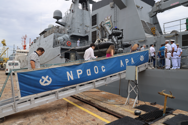 Continuando no 1º DN, o CIV subiu a bordo do navio-patrulha oceânico APA, que realiza operações de busca e de salvamento, controle de área marítima, patrulha naval e fiscalização do cumprimento das leis nas águas jurisdicionais brasileiras sob s jurisdição do 1º DN. O capitão de fragata Thiago Montilla Tavares de Almeida recebeu os representantes do MPM, fez explanação sobre a embarcação e as atividades desenvolvidas pelo APA e, ao final, conduziu os presentes por algumas partes do navio.