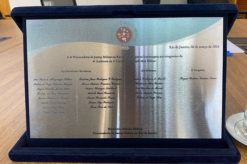 Durante a visita, o juiz federal Jocleber Vasconcelos e a diretora de Secretaria Ana Paula Ribeiro foram agraciados com o Medalhão do Centenário do Ministério Público Militar. Também foi entregue uma placa homenageando todos os servidores da 4ª Auditoria da 1ª CJM.