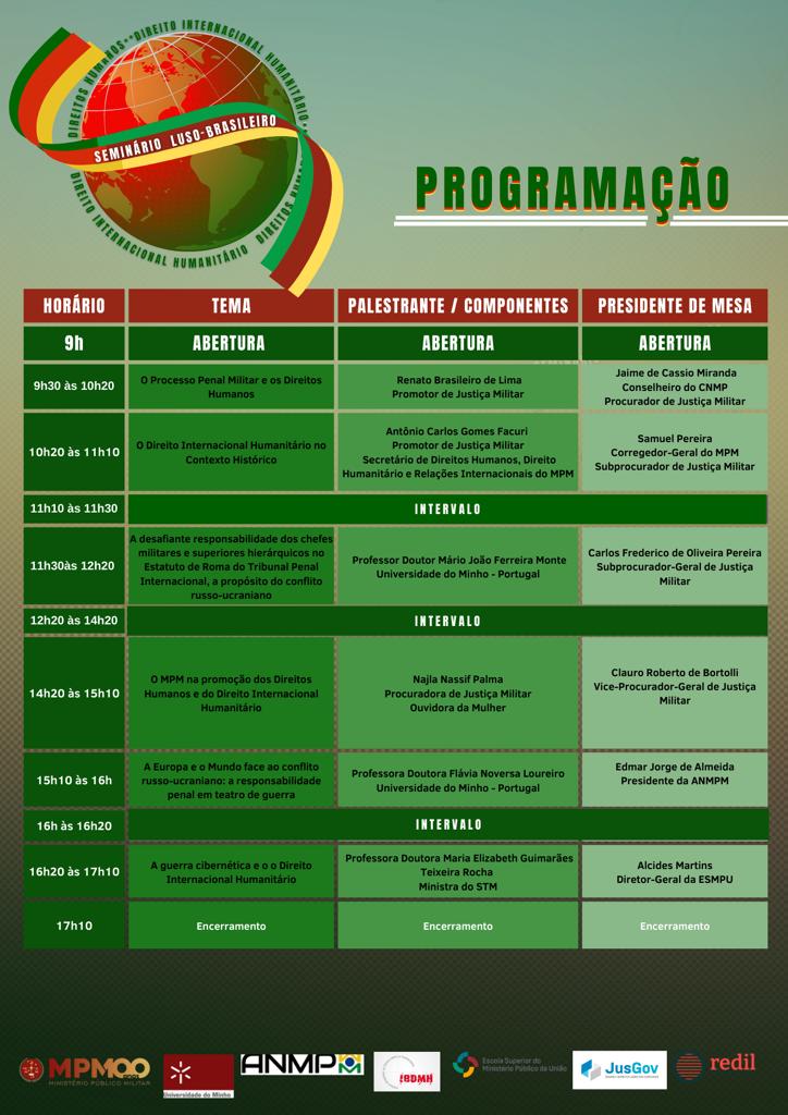 Estão abertas, até dia 28 de novembro de 2022, as inscrições para o Seminário Luso-brasileiro de Direitos Humanos e Direito Internacional Humanitário, a ser realizado no dia 29 de novembro, das 9h às 17h30, no auditório da Procuradoria-Geral de Justiça Militar, em Brasília. Organizado pelo Ministério Público Militar, com o apoio da Universidade do Minho – Portugal, o Seminário também será transmitido pelo canal oficial do MPM no Youtube.