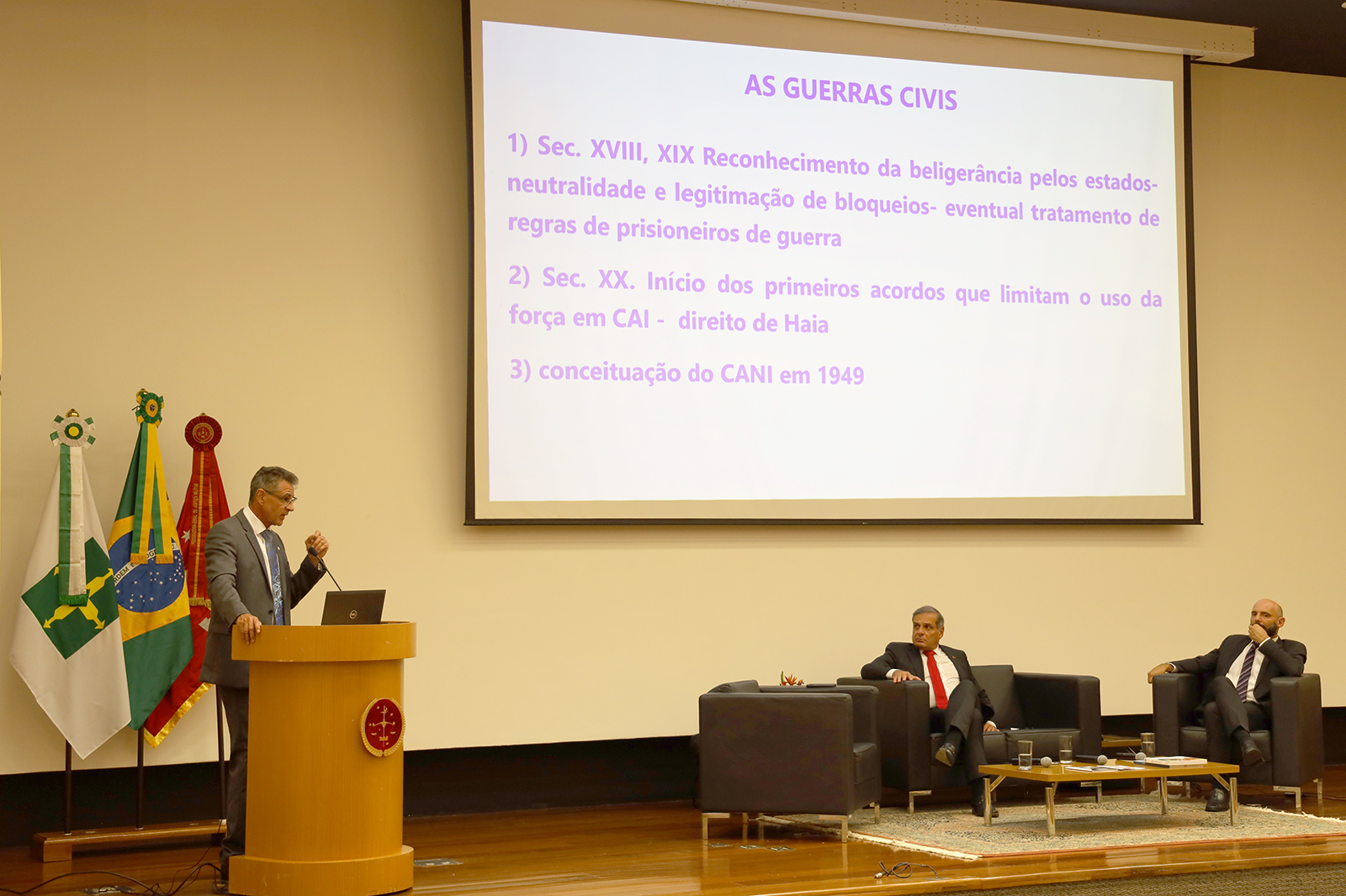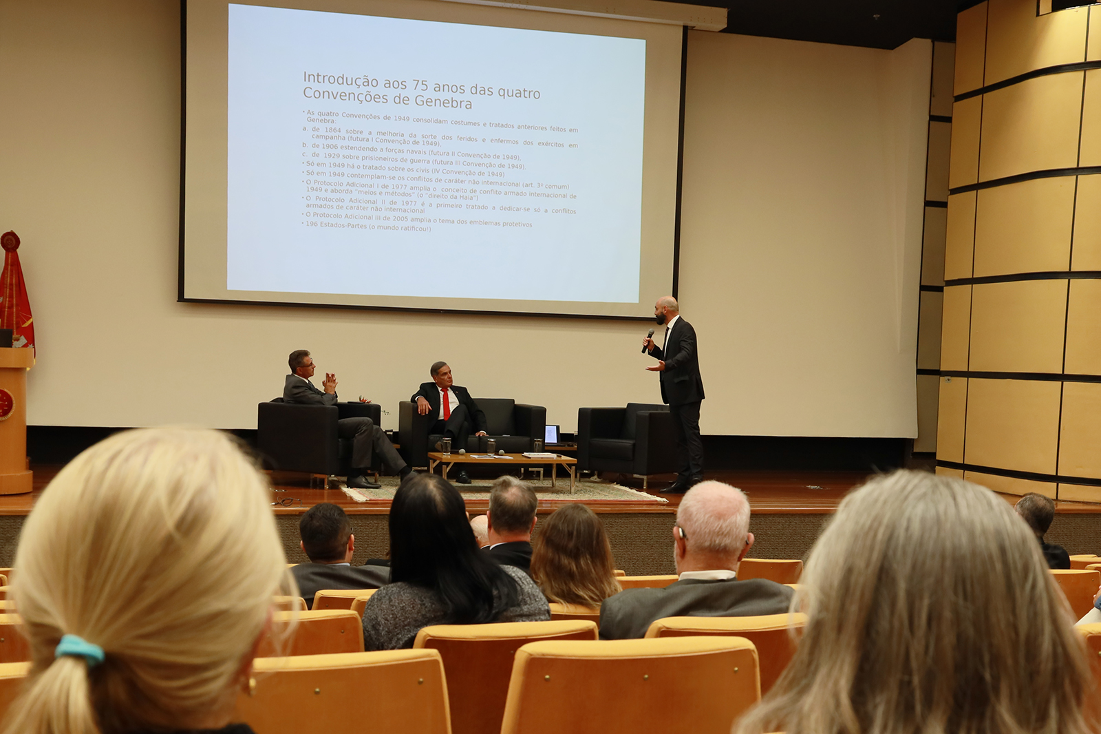 O Painel – Considerações sobre a aplicabilidade das Convenções de Genebra no mundo de hoje, foi mediado pelo subprocurador-geral de Justiça Militar e presidente do Conselho Curador do Instituto Brasileiro de Direito Militar e Humanitário (IBDMH), Giovanni Rattacaso e contou com a participação do consultor legislativo do Senado Federal para Relações Internacionais e Defesa Nacional Tarciso Dal Maso Jardim, convidado para falar sobre os “Conflitos armados internacionais” e do subprocurador-geral de Justiça Militar Carlos Frederico de Oliveira Pereira, falando sobre “Conflitos armados não internacionais”.