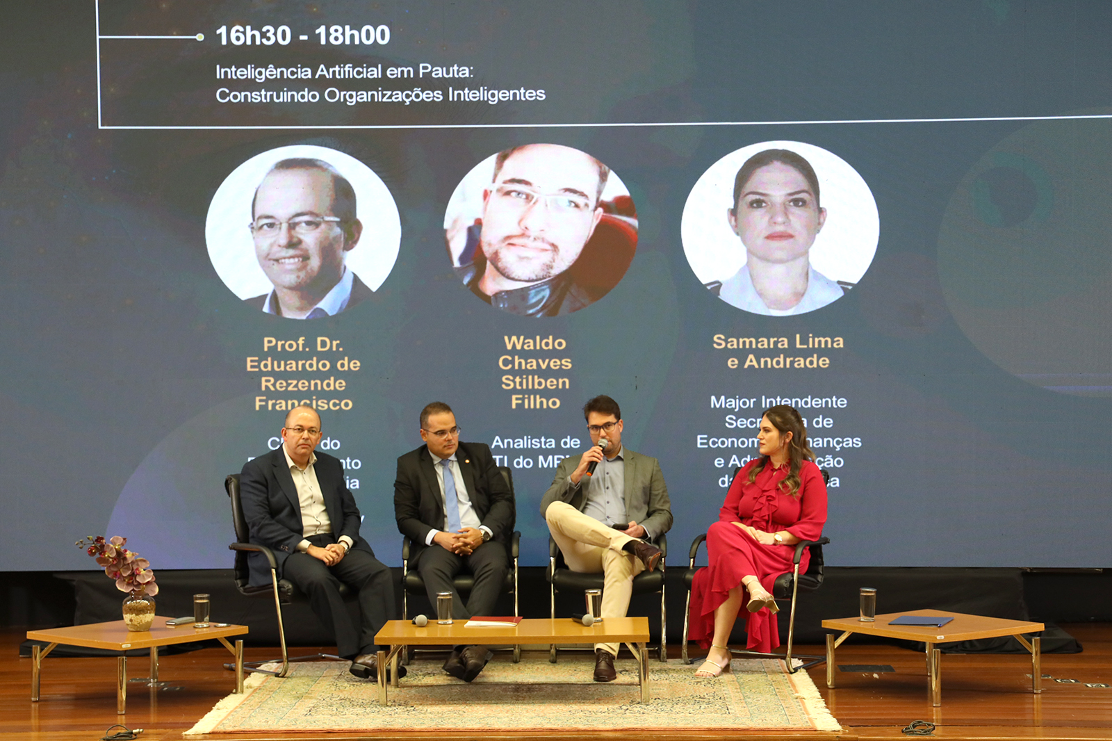 Waldo Stilben destacou o olhar das instituições, muito mais crítico e atento, às demandas que surgem, e como a inteligência artificial (IA) pode ser aplicada nas rotinas e processos auxiliando no aumento de eficiência. Já o professor Eduardo de Rezende abordou conceitos, fundamentos, estados da arte e tendências da IA. Como o uso da IA proporciona maior agilidade, eficácia e precisão, contribuindo na tomada de decisões e na redução de custos. Já a major Samara Lima discorreu sobre a governança como base para a inovação nas organizações. Tudo alinhado ao planejamento estratégico e com mecanismos claros e definições de políticas e diretrizes internas. Destacou ainda o dado como o ativo organizacional mais importante da instituição, de maneira que os gestores saibam lidar de forma segura e eficaz com esse bem.