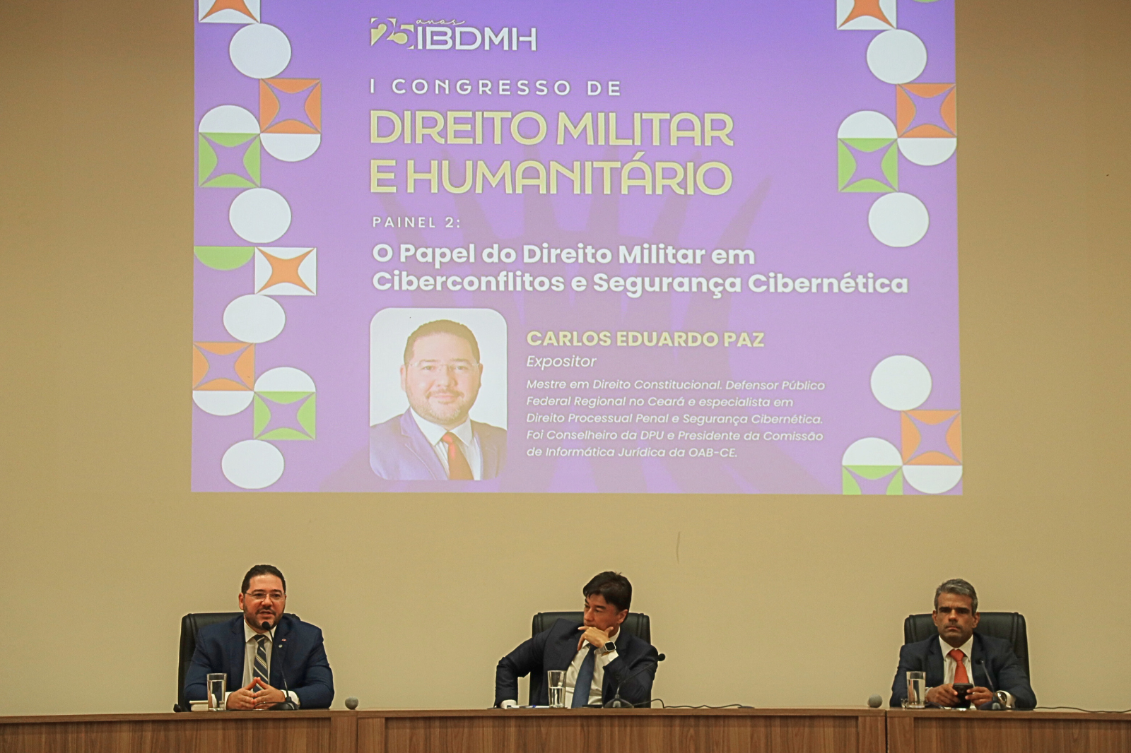 O defensor Público Federal Carlos Eduardo Paz abordou o tema “O papel do Direito Militar em ciberconflitos e segurança cibernética”, no segundo painel do Congresso. O debatedor da atividade foi o conselheiro nacional de Justiça João Paulo Schoucair e o moderador, o conselheiro nacional do Ministério Público Moacyr Rei Filho.