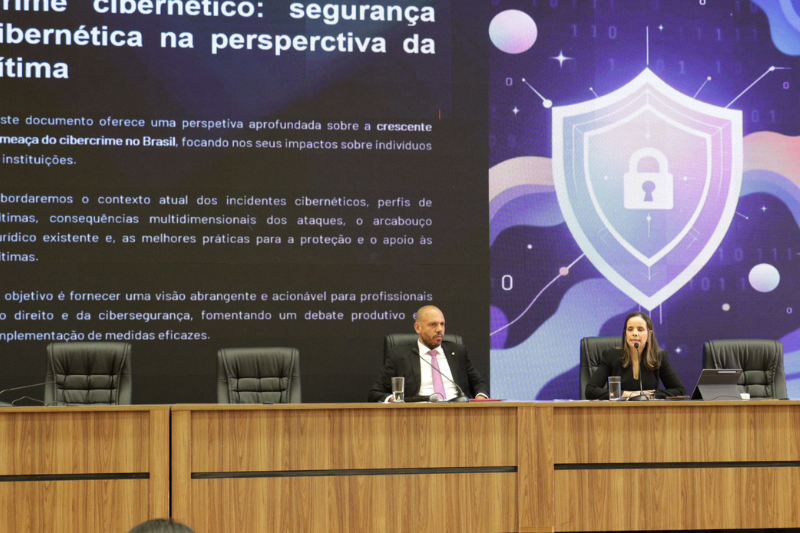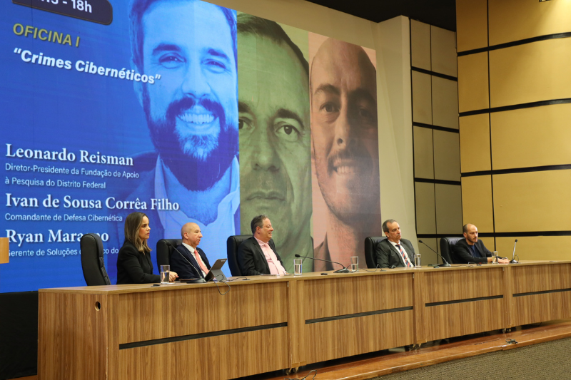 Fechando o primeiro dia do Seminário “Vítimas: compreender, proteger e reparar”, foi promovida uma Oficina sobre “Crimes Cibernéticos” com a superintendente Científica, Tecnológica e de Inovação da Fundação de Apoio à pesquisa do Distrito Federal (FAPDF), Renata Vianna, o comandante de Defesa Cibernética do Exército Brasileiro, Ivan de Sousa Corrêa Filho, e o gerente de Soluções do Banco do Brasil, Ryan Maragno.