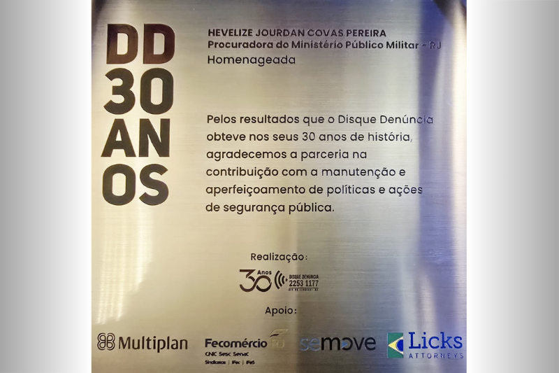 A procuradora de Justiça Militar no Rio de Janeiro/RJ Hevelize Jourdan Covas Pereira foi homenageada durante cerimônia de celebração dos 30 anos do Disque Denúncia do Rio de Janeiro, realizada no início deste mês no Morro do Corcovado, no Rio de Janeiro/RJ. O Ministério Público Militar, por meio da Procuradoria de Justiça Militar no Rio de Janeiro, é parceiro do Disque Denúncia.