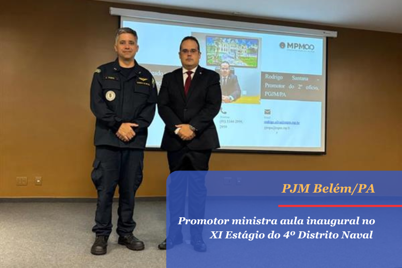 O promotor de Justiça Militar Rodrigo Santana de Souza e Silva ministrou a Aula Inaugural do “XI Estágio Qualificação em Investigação Criminal para Oficiais” do Comando do 4º Distrito Naval/4º DN, em Belém-PA. O evento ocorreu na manhã do dia 23/3 e contou com a presença do chefe do Estado-Maior do Comando do 4ºDistrito Naval, contra-almirante José Fabio Carneiro da Silva.