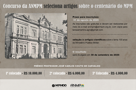 Estão abertas as inscrições do concurso da Associação Nacional do Ministério Público Militar (ANMPM) para seleção de artigos científicos sobre o tema 100 anos do Ministério Público Militar. As inscrições são gratuitas e foram prorrogadas até o dia 31 de agosto. . .2 de junho de 2020