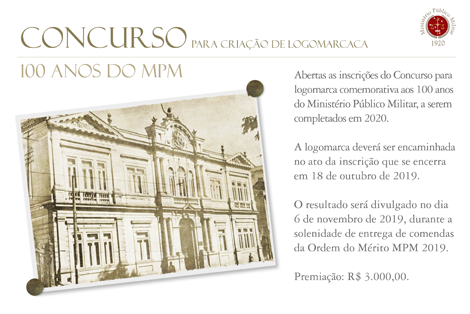 O Ministério Público Militar lançou concurso para escolha da logomarca comemorativa aos 100 anos da Instituição. Clique aqui e leia o Edital. O concurso é aberto a toda a comunidade e as inscrições com a respectiva sugestão de logomarca devem ser feitas até o dia 18 . . .7 de outubro de 2019