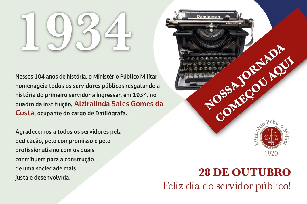 Nesses 104 anos de história, o Ministério Público Militar homenageia todos os servidores públicos resgatando a história do primeiro servidor a ingressar, em 1934, no quadro da instituição, Alziralinda Sales Gomes da Costa, ocupante do cargo de datilógrafa.Agradecemos a t. . .28 de outubro de 2024