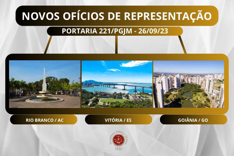 Foi publicada no Diário Oficial da União e entrou em vigor no dia 26 de setembro a Portaria nº 221/PGJM, que cria novos Ofícios de Representação do Ministério Público Militar (MPM) em Vitória/ES, Goiânia/GO e Rio Branco/AC. Assinada pelo procurador-geral de Justiça M. . .28 de setembro de 2023