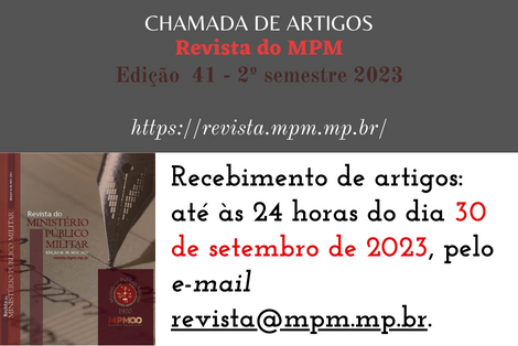 Está aberto o Edital de chamada de artigos para Edição 41 da Revista do Ministério Público Militar, com lançamento em novembro de 2023. Os articulistas terão até as 24 horas do dia 30 de setembro de 2023 para enviar seus manuscritos, pelo endereço eletrônico revista@. . .28 de agosto de 2023