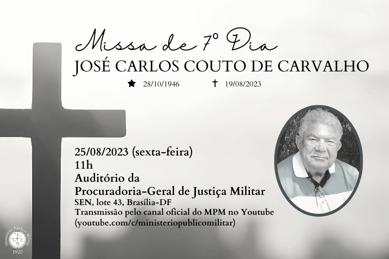 A Missa de 7º Dia pelo falecimento do subprocurador-geral de Justiça Militar José Carlos Couto de Carvalho será realizada no dia 25 de agosto de 2023 (sexta-feira) às 11 horas, no Auditório da Procuradoria-Geral de Justiça Militar, em Brasília. A cerimônia também s. . .23 de agosto de 2023