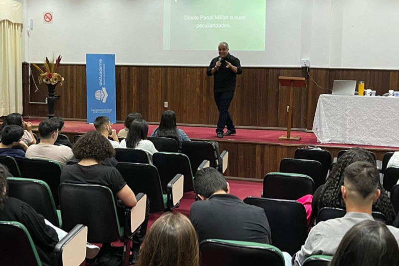 O procurador de Justiça Militar Ulysses da Silva Costa Filho ministrou a palestra "As peculiaridades do Direito Militar", na semana passada, no Centro Universitário Academia – UniAcademia, em Juiz de Fora/MG, destinada aos alunos do curso de Direito daquela instituição.. . .4 de setembro de 2023