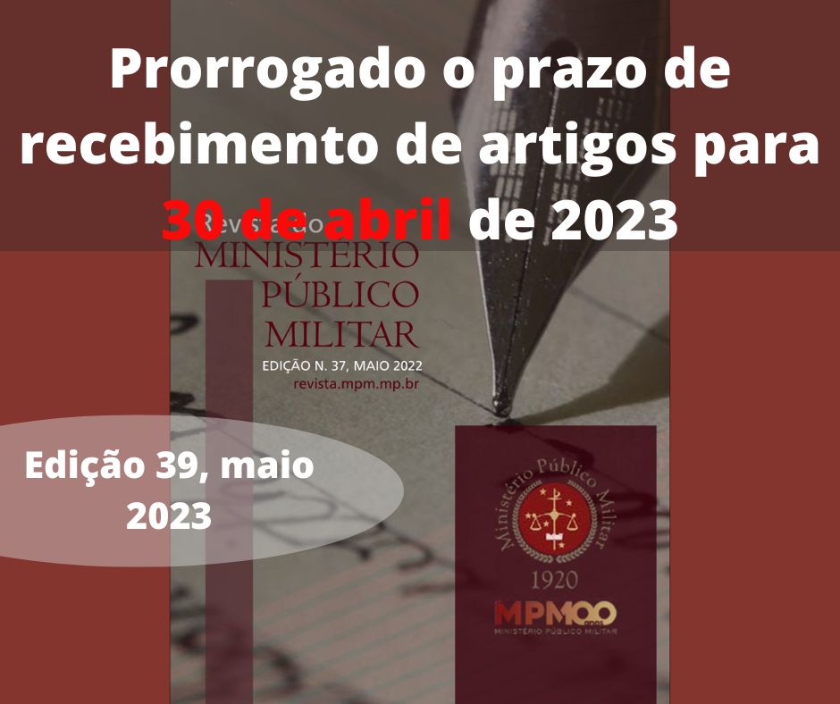 O Conselho Editorial do MPM prorrogou o prazo para entrega de artigos para a Edição 39 da Revista do MPM para o dia 30 de abril de 2023. As pesquisas podem abranger matérias do Direito Militar, Direito Público, Direito Internacional Penal, Direitos Humanos e Direito Internac. . .28 de março de 2023