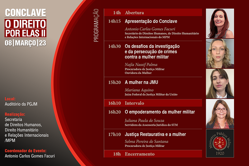 Em celebração ao Dia Internacional da Mulher, a Secretaria de Direitos Humanos, Direito Humanitário e Relações Internacionais do MPM promove, no dia 8 de março, a partir das 14h, o Conclave O Direito por Elas II, no Auditório Subprocuradora-Geral Adriana Lorandi, da Pr. . .6 de março de 2023