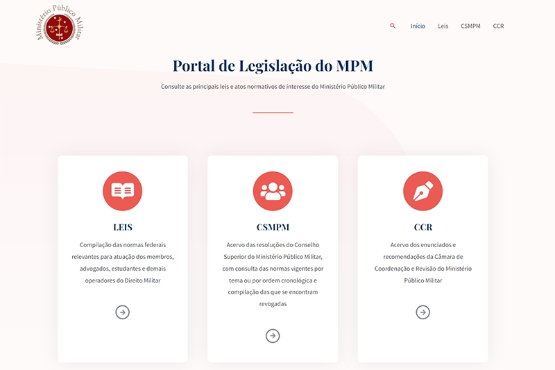 O Ministério Público Militar disponibilizou em sua página eletrônica o Portal de Legislação do Ministério Público Militar (https://legislacao.mpm.mp.br). A iniciativa inovadora no MPM integra o projeto de aperfeiçoamento dos portais de legislação dos Ministérios. . .17 de janeiro de 2023