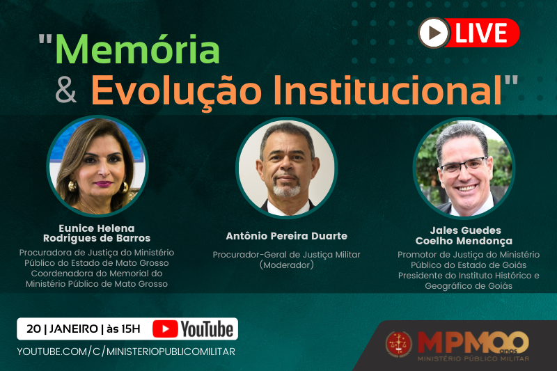 O Ministério Público Militar promove, no dia 20 de janeiro de 2023, às 15 horas, mais uma edição da Lives do MPM com o tema “Memória e evolução institucional”. O debate contará com a presença de Eunice Helena Rodrigues de Barros, procuradora de Justiça do Minist. . .18 de janeiro de 2023