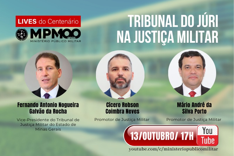 Acontece na próxima quinta-feira (13), às 17 horas, no canal oficial do MPM no Youtube, a Live do Centenário com o tema "Tribunal do Júri na Justiça Militar". A atividade será mediada pelo promotor de Justiça Militar Cícero Robson Coimbra Neves e contará com a part. . .13 de outubro de 2022