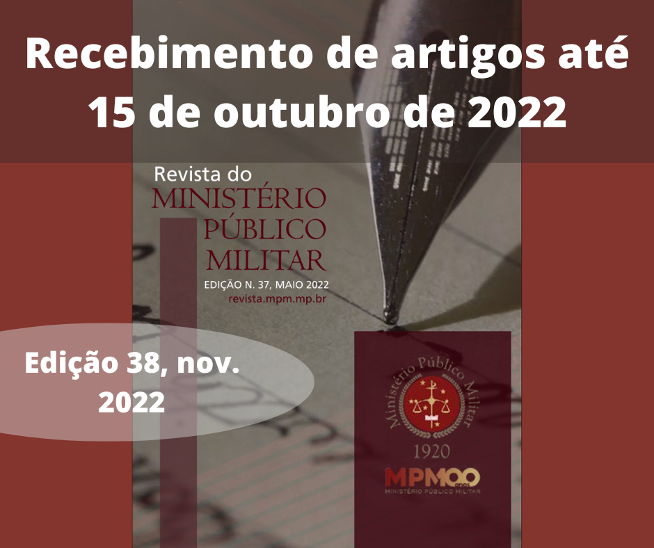 O Conselho Editorial do Ministério Público Militar prorrogou o prazo para recebimento de artigos que serão escolhidos para a publicação da Edição 38 da Revista do Ministério Público Militar, para até o dia 15 de outubro de 2022. 1. Os artigos científicos deverão s. . .29 de setembro de 2022