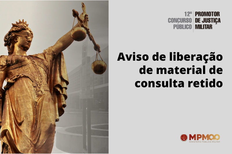 A Secretaria da Comissão do 12º Concurso Público para Promotor de Justiça Militar - 12º CPJM informa que o material de consulta retido no dia da prova subjetiva do Grupo de Matérias - GIII já pode ser retirado pelo candidato diretamente na sede da Procuradoria de Justi. . .30 de agosto de 2022