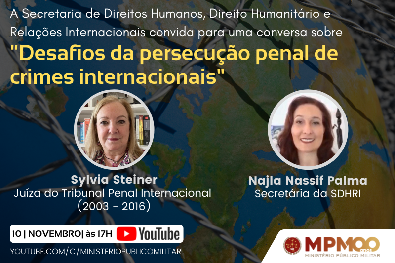 A Secretaria de Direitos Humanos, Direito Humanitário e Relações Internacionais (SDHRI) promove no dia 10 de novembro, às 17 horas, a Conversa virtual sobre Desafios da persecução penal de crimes internacionais, com ajuíza do Tribunal Penal Internacional de 2003 a 2016. . .5 de novembro de 2021