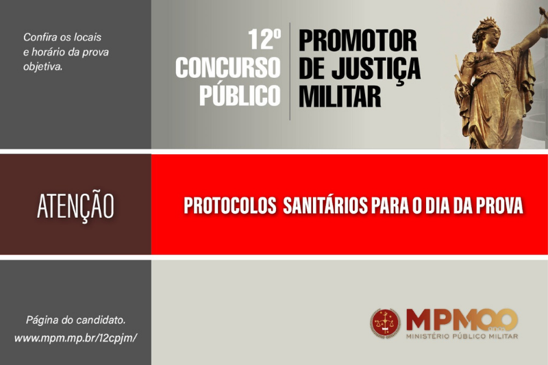 A prova objetiva do 12º Concurso Público para Promotor de Justiça Militar acontecerá neste domingo, 24 de outubro de 2021, no horário das 9 às 14 horas, com fechamento dos portões às 8h30 (horário oficial de Brasília). Fique atento aos protocolos sanitários! - . . .23 de outubro de 2021
