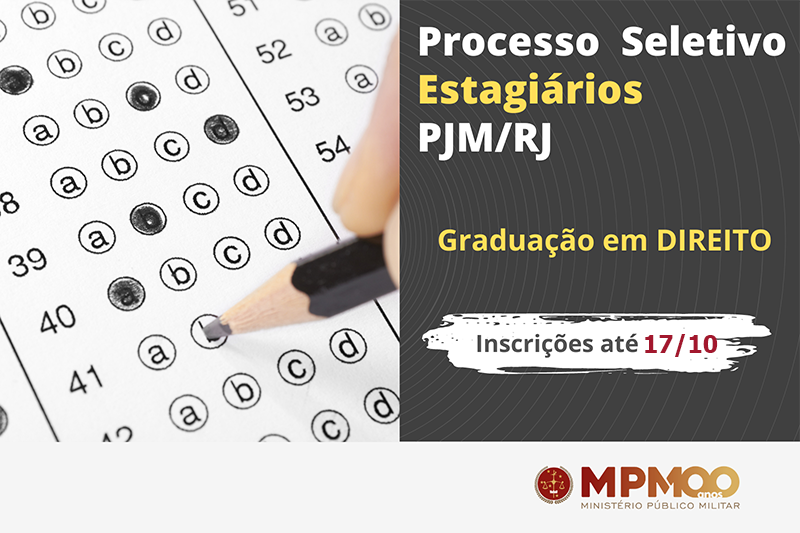 A Procuradoria de Justiça Militar no Rio de Janeiro, conforme o Edital PJM/RJ nº 01, de 13 de outubro de 2021, prorrogou, até 17 de outubro de 2021, o prazo para inscrições no processo seletivo com vistas à contratação e formação do quadro de reserva de estagiários d. . .15 de outubro de 2021
