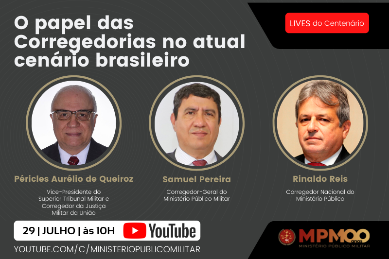 O Ministério Público Militar realiza no dia 29 de julho de 2021, às 10 horas, mais uma edição da Lives do Centenário do MPM. O tema O papel das corregedorias no atual cenário brasileiro será debatido pelo vice-presidente do Superior Tribunal Militar e corregedor da Ju. . .29 de julho de 2021