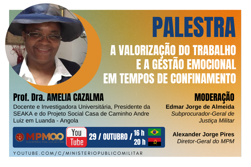 A Valorização do Trabalho e a Gestão Emocional em tempos de Confinamento é o tema da palestra a ser transmitida, na próxima quinta-feira (29), às 16 horas, pelo canal oficial do MPM no Youtube. A palestrante será a professora Doutora Amelia Carlos Cazalma, PhD em Ci. . .27 de outubro de 2020