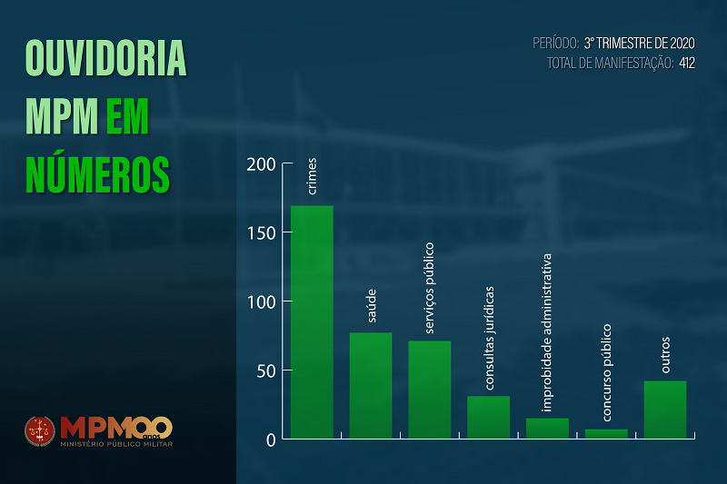 A Ouvidoria do Ministério Público Militar divulgou o relatório estatístico de sua atuação referente ao 3º trimestre de 2020 (julho a setembro). Foram registradas 412 manifestações no período. Desse total, 169 eram relatos de crimes, 77 tratavam de questões de saúd. . .16 de outubro de 2020